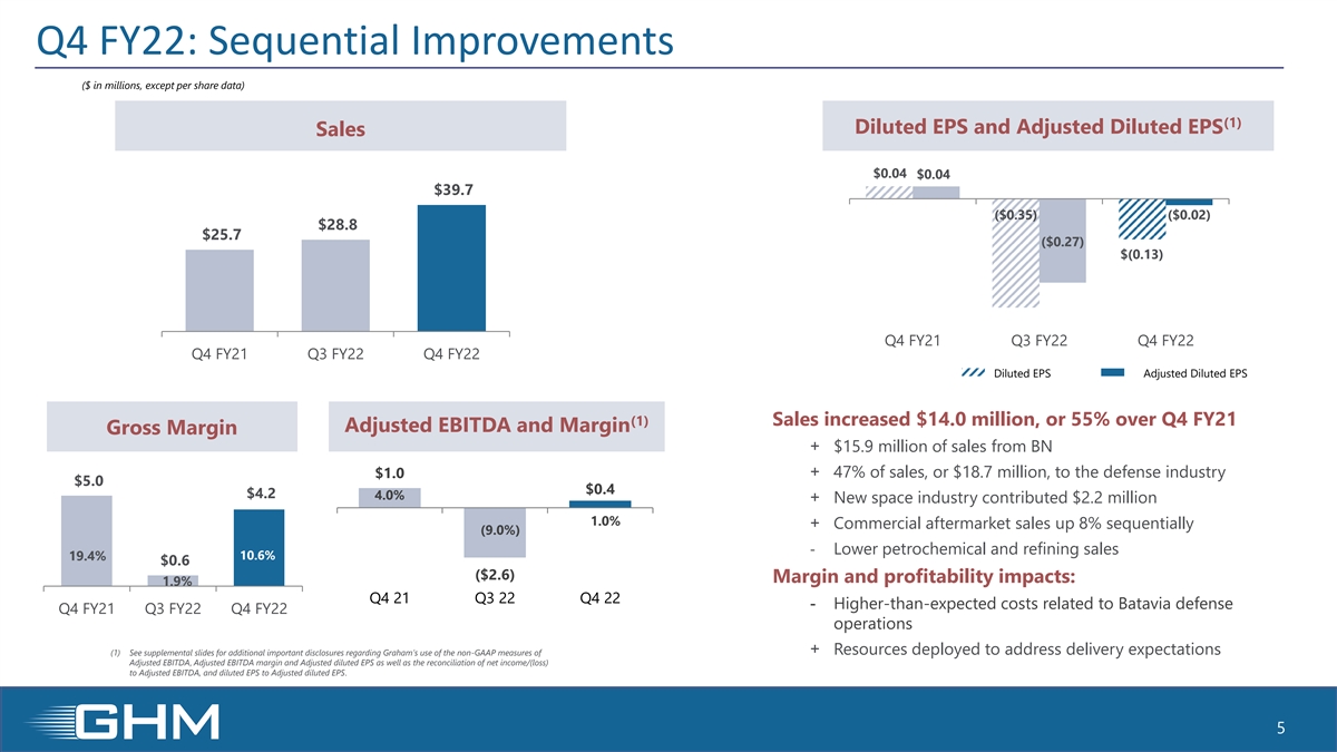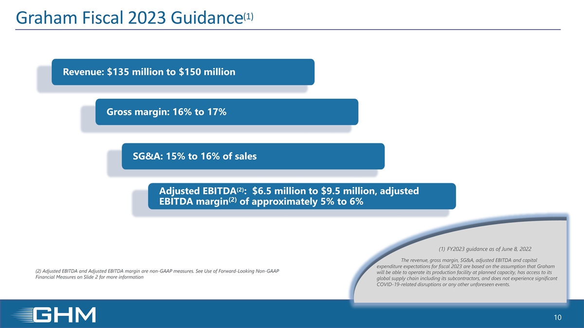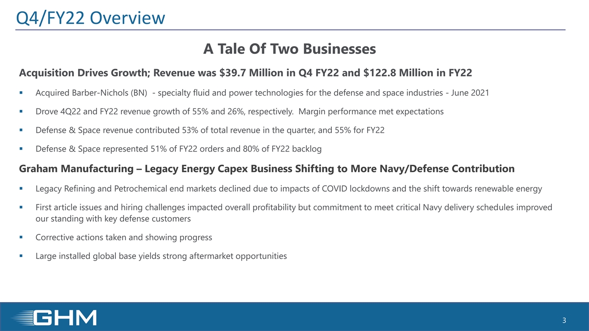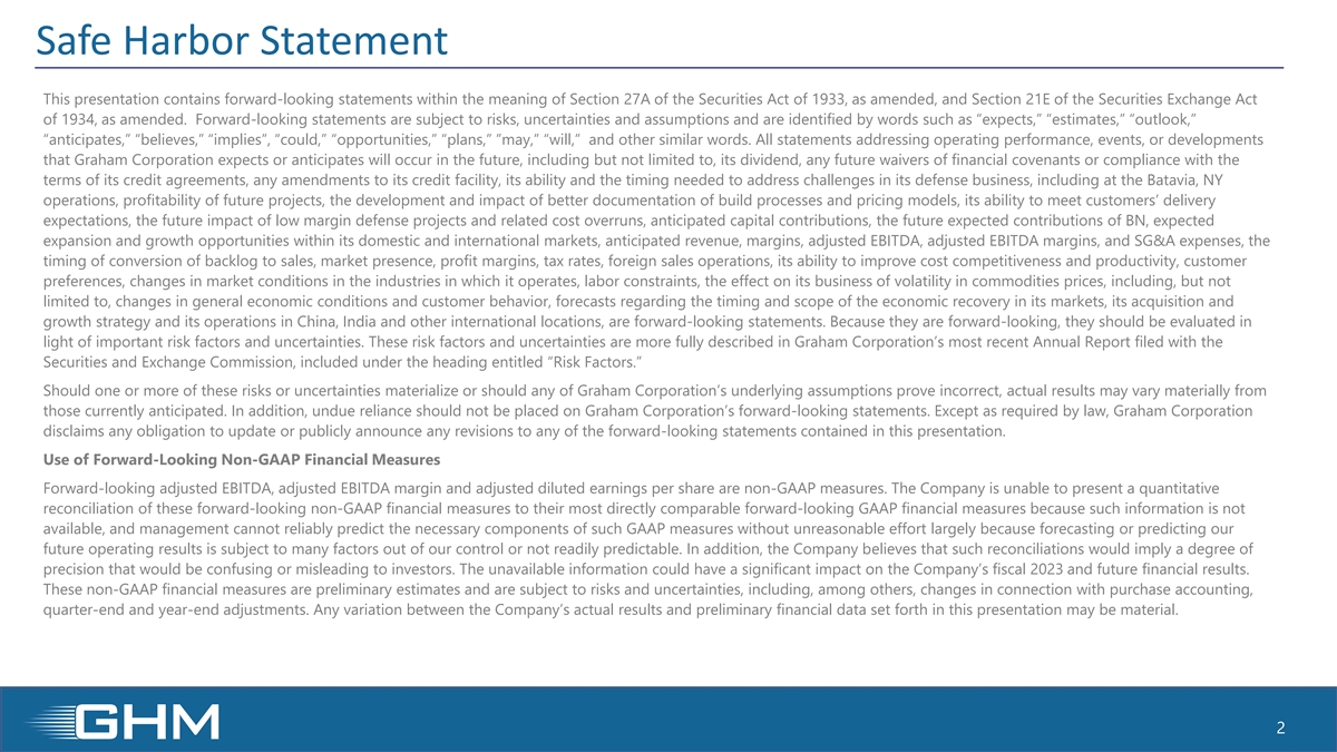 Safe Harbor Statement This presentation contains forward-looking statements within the meaning of Section 27A of the Securities Act of 1933, as amended, and Section 21E of the Securities Exchange Act of 1934, as amended. Forward-looking statements are subject to risks, uncertainties and assumptions and are identified by words such as “expects,” “estimates,” “outlook,” “anticipates,” “believes,” “implies”, “could,” “opportunities,” “plans,” ”may,” “will,” and other similar words. All statements addressing operating performance, events, or developments that Graham Corporation expects or anticipates will occur in the future, including but not limited to, its dividend, any future waivers of financial covenants or compliance with the terms of its credit agreements, any amendments to its credit facility, its ability and the timing needed to address challenges in its defense business, including at the Batavia, NY operations, profitability of future projects, the development and impact of better documentation of build processes and pricing models, its ability to meet customers’ delivery expectations, the future impact of low margin defense projects and related cost overruns, anticipated capital contributions, the future expected contributions of BN, expected expansion and growth opportunities within its domestic and international markets, anticipated revenue, margins, adjusted EBITDA, adjusted EBITDA margins, and SG&A expenses, the timing of conversion of backlog to sales, market presence, profit margins, tax rates, foreign sales operations, its ability to improve cost competitiveness and productivity, customer preferences, changes in market conditions in the industries in which it operates, labor constraints, the effect on its business of volatility in commodities prices, including, but not limited to, changes in general economic conditions and customer behavior, forecasts regarding the timing and scope of the economic recovery in its markets, its acquisition and growth strategy and its operations in China, India and other international locations, are forward-looking statements. Because they are forward-looking, they should be evaluated in light of important risk factors and uncertainties. These risk factors and uncertainties are more fully described in Graham Corporation’s most recent Annual Report filed with the Securities and Exchange Commission, included under the heading entitled “Risk Factors.” Should one or more of these risks or uncertainties materialize or should any of Graham Corporation’s underlying assumptions prove incorrect, actual results may vary materially from those currently anticipated. In addition, undue reliance should not be placed on Graham Corporation’s forward-looking statements. Except as required by law, Graham Corporation disclaims any obligation to update or publicly announce any revisions to any of the forward-looking statements contained in this presentation. Use of Forward-Looking Non-GAAP Financial Measures Forward-looking adjusted EBITDA, adjusted EBITDA margin and adjusted diluted earnings per share are non-GAAP measures. The Company is unable to present a quantitative reconciliation of these forward-looking non-GAAP financial measures to their most directly comparable forward-looking GAAP financial measures because such information is not available, and management cannot reliably predict the necessary components of such GAAP measures without unreasonable effort largely because forecasting or predicting our future operating results is subject to many factors out of our control or not readily predictable. In addition, the Company believes that such reconciliations would imply a degree of precision that would be confusing or misleading to investors. The unavailable information could have a significant impact on the Company’s fiscal 2023 and future financial results. These non-GAAP financial measures are preliminary estimates and are subject to risks and uncertainties, including, among others, changes in connection with purchase accounting, quarter-end and year-end adjustments. Any variation between the Company’s actual results and preliminary financial data set forth in this presentation may be material. 2