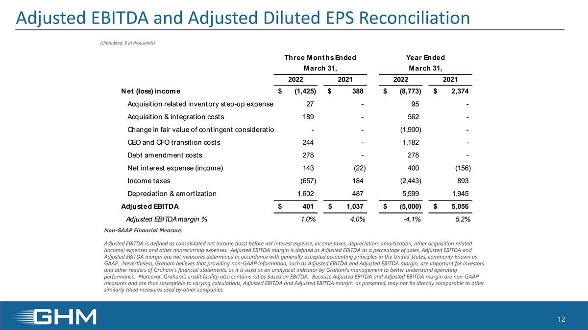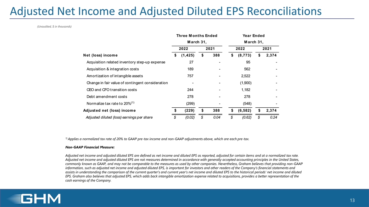 Adjusted EBITDA and Adjusted Diluted EPS Reconciliation (Unaudited, $ in thousands) Three Months Ended Year Ended March 31, March 31, 2022 2021 2022 2021 Net (loss) income $ (1,425) $ 388 $ (8,773) $ 2,374 Acquisition related inventory step-up expense 27 - 95 - Acquisition & integration costs 189 - 562 - Change in fair value of contingent consideration - - (1,900) - CEO and CFO transition costs 244 - 1,182 - Debt amendment costs 278 - 278 - Net interest expense (income) 143 (22) 400 ( 156) Income taxes ( 657) 184 ( 2,443) 893 Depreciation & amortization 1,602 487 5,599 1 ,945 Adjusted EBITDA $ 401 $ 1 ,037 $ (5,000) $ 5 ,056 Adjusted EBITDA margin % 1.0% 4.0% -4.1% 5.2% Non-GAAP Financial Measure: Adjusted EBITDA is defined as consolidated net income (loss) before net interest expense, income taxes, depreciation, amortization, other acquisition related (income) expenses and other nonrecurring expenses. Adjusted EBITDA margin is defined as Adjusted EBITDA as a percentage of sales. Adjusted EBITDA and Adjusted EBITDA margin are not measures determined in accordance with generally accepted accounting principles in the United States, commonly known as GAAP. Nevertheless, Graham believes that providing non-GAAP information, such as Adjusted EBITDA and Adjusted EBITDA margin, are important for investors and other readers of Graham's financial statements, as it is used as an analytical indicator by Graham's management to better understand operating performance. Moreover, Graham’s credit facility also contains ratios based on EBITDA. Because Adjusted EBITDA and Adjusted EBITDA margin are non-GAAP measures and are thus susceptible to varying calculations, Adjusted EBITDA and Adjusted EBITDA margin, as presented, may not be directly comparable to other similarly titled measures used by other companies. 12