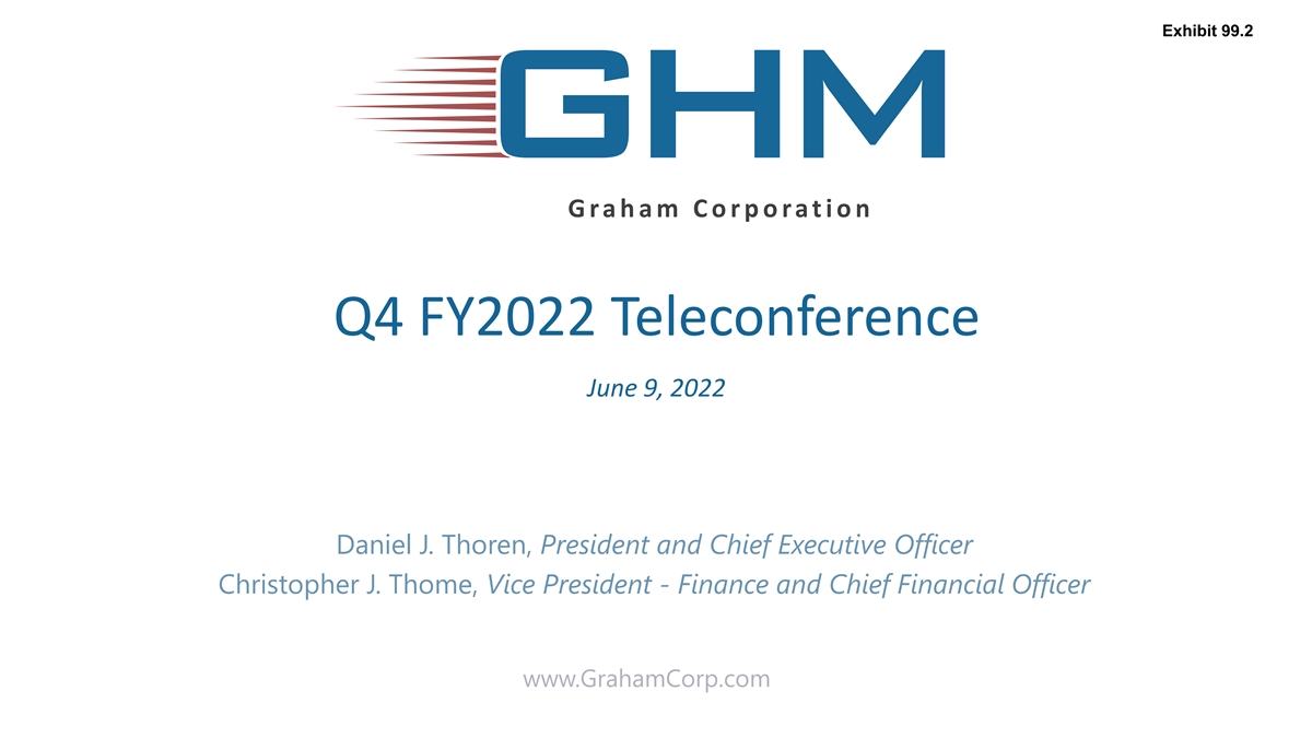 Exhibit 99.2 G r a h a m C o r p o r a t i o n Q4 FY2022 Teleconference June 9, 2022 Daniel J. Thoren, President and Chief Executive Officer Christopher J. Thome, Vice President - Finance and Chief Financial Officer www.GrahamCorp.com