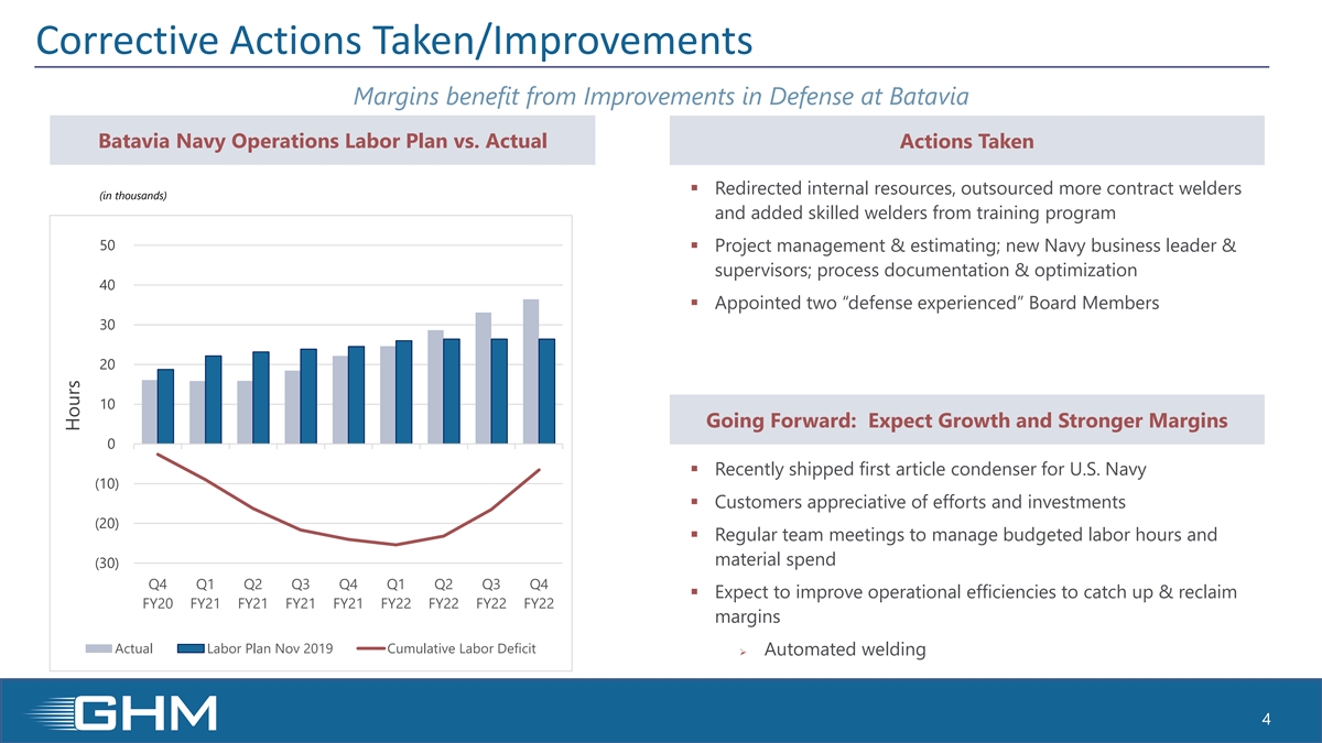 Corrective Actions Taken/Improvements Margins benefit from Improvements in Defense at Batavia Batavia Navy Operations Labor Plan vs. Actual Actions Taken ▪ Redirected internal resources, outsourced more contract welders (in thousands) and added skilled welders from training program 50 ▪ Project management & estimating; new Navy business leader & supervisors; process documentation & optimization 40 ▪ Appointed two “defense experienced” Board Members 30 20 10 Going Forward: Expect Growth and Stronger Margins 0 ▪ Recently shipped first article condenser for U.S. Navy (10) ▪ Customers appreciative of efforts and investments (20) ▪ Regular team meetings to manage budgeted labor hours and material spend (30) Q4 Q1 Q2 Q3 Q4 Q1 Q2 Q3 Q4 ▪ Expect to improve operational efficiencies to catch up & reclaim FY20 FY21 FY21 FY21 FY21 FY22 FY22 FY22 FY22 margins Actual Labor Plan Nov 2019 Cumulative Labor Deficit ➢ Automated welding 4 Hours
