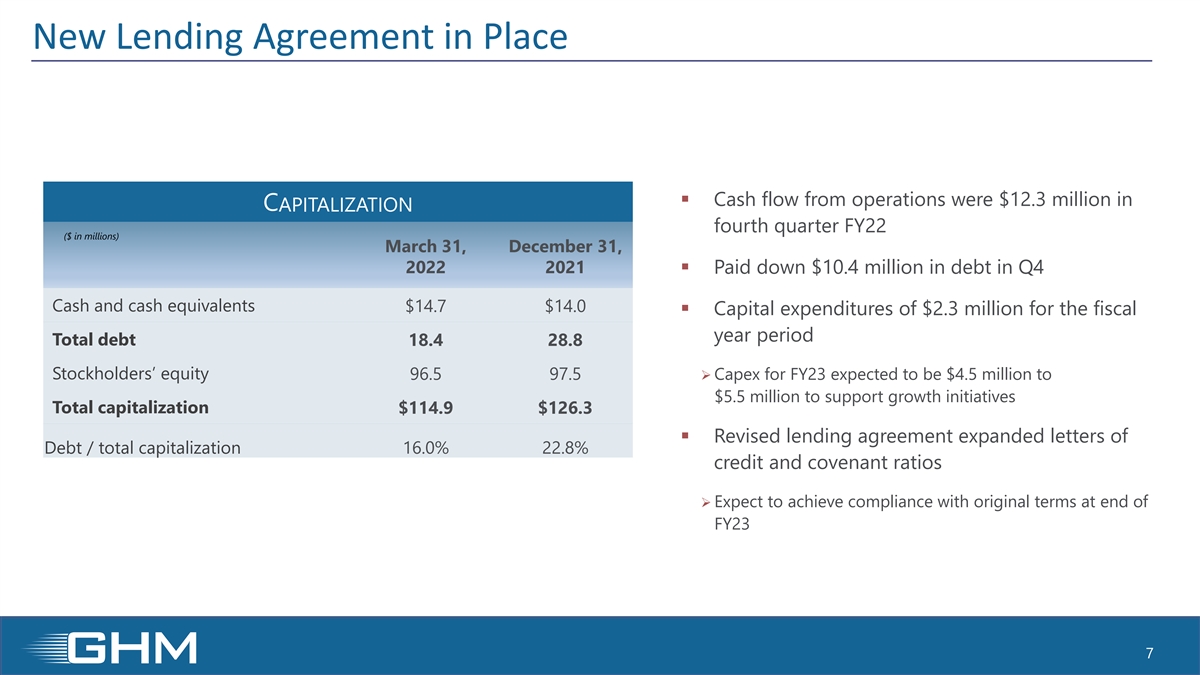 FY2022: Strategic Diversification into Defense ($ in millions, except per share data) (1) Sales Adjusted EBITDA and Margin $5.1 $122.8 5.2% $97.5 $(5.0) (4.1%) FY 2021 FY 2022 FY 2021 FY 2022 Sales increased 26% driven by defense industry + $47.9 million of sales from BN; 51% of revenue related to (1) Gross Margin Diluted EPS & Adjusted Diluted EPS defense industry, up 2.6x + Space became a meaningful contributor $20.5 + Commercial aftermarket orders and sales expanded – $0.24 $0.24 leading indicator of future energy capex ($0.62) $9.1 - Lower petrochemical and refining sales – primarily in Asia 21.0% 7.4% ($0.83) Margin and profitability impacts: FY 2021 FY 2022 - Timing of lower margin defense projects FY 2021 FY 2022 Diluted EPS Adjusted Diluted EPS + Space became a meaningful contributor (1) See supplemental slides for additional important disclosures regarding Graham’s use of the non-GAAP measures of Adjusted EBITDA, Adjusted EBITDA margin and Adjusted diluted EPS as well as the reconciliation of net income/(loss) + Increase in commercial aftermarket sales to Adjusted EBITDA and diluted EPS to Adjusted diluted EPS. 6