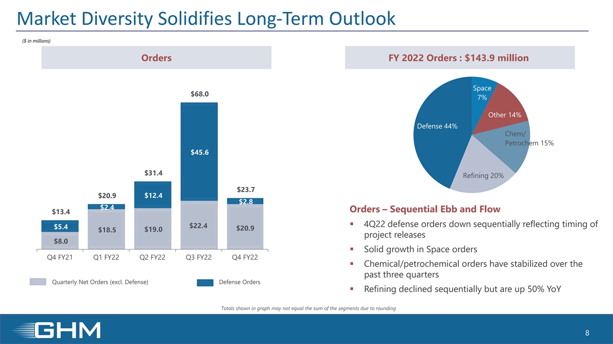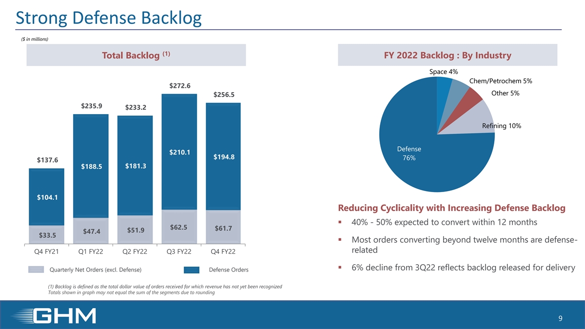 Market Diversity Solidifies Long-Term Outlook ($ in millions) Orders FY 2022 Orders : $143.9 million Space $68.0 7% Other 14% Defense 44% Chem/ Petrochem 15% $45.6 $31.4 Refining 20% $23.7 $20.9 $12.4 $2.8 $2.4 Orders – Sequential Ebb and Flow $13.4 ▪ 4Q22 defense orders down sequentially reflecting timing of $22.4 $5.4 $20.9 $19.0 $18.5 project releases $8.0 ▪ Solid growth in Space orders Q4 FY21 Q1 FY22 Q2 FY22 Q3 FY22 Q4 FY22 ▪ Chemical/petrochemical orders have stabilized over the past three quarters Quarterly Net Orders (excl. Defense) Defense Orders ▪ Refining declined sequentially but are up 50% YoY Totals shown in graph may not equal the sum of the segments due to rounding 8