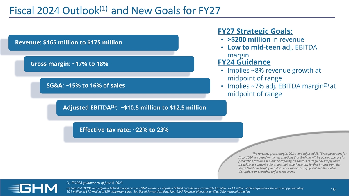 (1) Fiscal 2024 Outlook and New Goals for FY27 FY27 Strategic Goals: • >$200 million in revenue Revenue: $165 million to $175 million • Low to mid-teen adj. EBITDA margin FY24 Guidance Gross margin: ~17% to 18% • Implies ~8% revenue growth at midpoint of range (2) SG&A: ~15% to 16% of sales • Implies ~7% adj. EBITDA margin at midpoint of range (2) Adjusted EBITDA : ~$10.5 million to $12.5 million Effective tax rate: ~22% to 23% The revenue, gross margin, SG&A, and adjusted EBITDA expectations for fiscal 2024 are based on the assumptions that Graham will be able to operate its production facilities at planned capacity, has access to its global supply chain including its subcontractors, does not experience any further impact from the Virgin Orbit bankruptcy and does not experience significant health-related disruptions or any other unforeseen events. (1) FY2024 guidance as of June 8, 2023 (2) Adjusted EBITDA and Adjusted EBITDA margin are non-GAAP measures. Adjusted EBITDA excludes approximately $2 million to $3 million of BN performance bonus and approximately 10 $0.5 million to $1.0 million of ERP conversion costs. See Use of Forward-Looking Non-GAAP Financial Measures on Slide 2 for more information