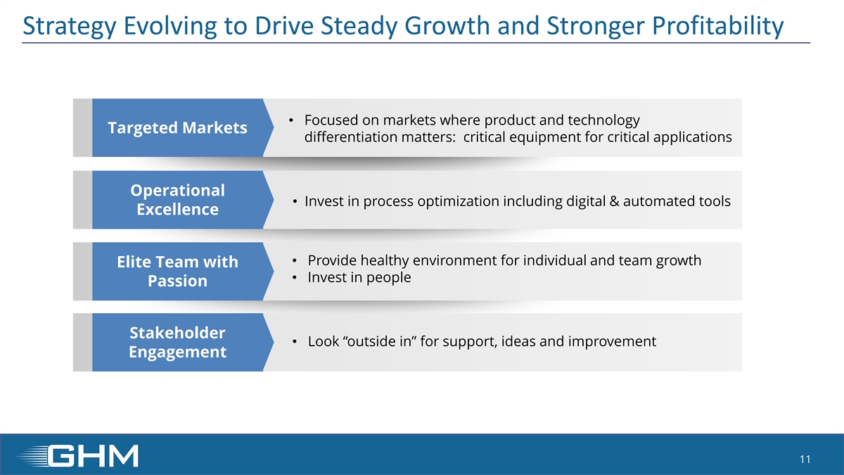 Strategy Evolving to Drive Steady Growth and Stronger Profitability • Focused on markets where product and technology Targeted Markets differentiation matters: critical equipment for critical applications Operational • Invest in process optimization including digital & automated tools Excellence • Provide healthy environment for individual and team growth Elite Team with • Invest in people Passion Stakeholder • Look “outside in” for support, ideas and improvement Engagement 11