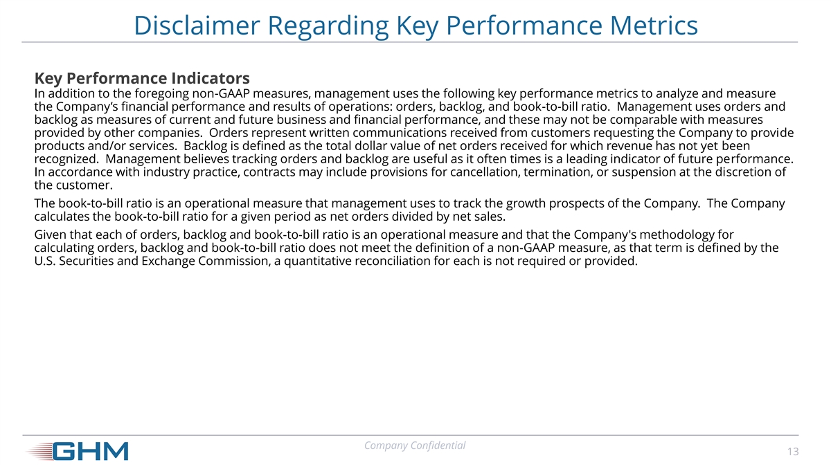 Disclaimer Regarding Key Performance Metrics Key Performance Indicators In addition to the foregoing non-GAAP measures, management uses the following key performance metrics to analyze and measure the Company’s financial performance and results of operations: orders, backlog, and book-to-bill ratio. Management uses orders and backlog as measures of current and future business and financial performance, and these may not be comparable with measures provided by other companies. Orders represent written communications received from customers requesting the Company to provide products and/or services. Backlog is defined as the total dollar value of net orders received for which revenue has not yet been recognized. Management believes tracking orders and backlog are useful as it often times is a leading indicator of future performance. In accordance with industry practice, contracts may include provisions for cancellation, termination, or suspension at the discretion of the customer. The book-to-bill ratio is an operational measure that management uses to track the growth prospects of the Company. The Company calculates the book-to-bill ratio for a given period as net orders divided by net sales. Given that each of orders, backlog and book-to-bill ratio is an operational measure and that the Company's methodology for calculating orders, backlog and book-to-bill ratio does not meet the definition of a non-GAAP measure, as that term is defined by the U.S. Securities and Exchange Commission, a quantitative reconciliation for each is not required or provided. Company Confidential 13