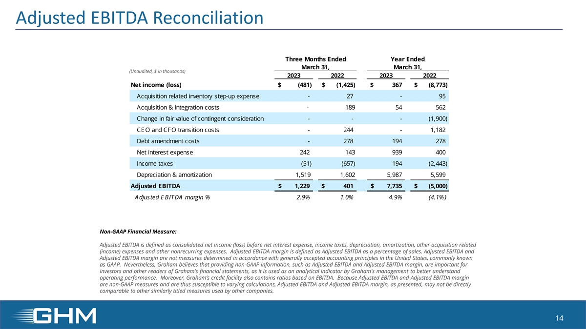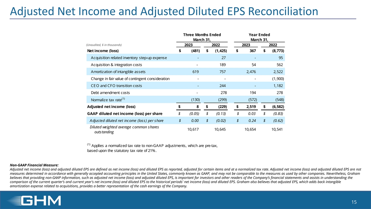 Adjusted EBITDA Reconciliation Three Months Ended Year Ended March 31, March 31, (Unaudited, $ in thousands) 2023 2022 2023 2022 Net income (loss) $ ( 481) $ (1,425) $ 367 $ ( 8,773) Acquisition related inventory step-up expense - 27 - 95 Acquisition & integration costs - 189 54 562 Change in fair value of contingent consideration - - - ( 1,900) CE O and CFO transition costs - 244 - 1,182 Debt amendment costs - 278 194 278 Net interest expense 242 143 939 400 Income taxes ( 51) (657) 194 (2,443) Depreciation & amortization 1,519 1,602 5 ,987 5,599 Adjusted EBITDA $ 1 ,229 $ 401 $ 7 ,735 $ (5,000) A djusted E BITDA margin % 2.9% 1.0% 4.9% (4.1%) Non-GAAP Financial Measure: Adjusted EBITDA is defined as consolidated net income (loss) before net interest expense, income taxes, depreciation, amortization, other acquisition related (income) expenses and other nonrecurring expenses. Adjusted EBITDA margin is defined as Adjusted EBITDA as a percentage of sales. Adjusted EBITDA and Adjusted EBITDA margin are not measures determined in accordance with generally accepted accounting principles in the United States, commonly known as GAAP. Nevertheless, Graham believes that providing non-GAAP information, such as Adjusted EBITDA and Adjusted EBITDA margin, are important for investors and other readers of Graham's financial statements, as it is used as an analytical indicator by Graham's management to better understand operating performance. Moreover, Graham’s credit facility also contains ratios based on EBITDA. Because Adjusted EBITDA and Adjusted EBITDA margin are non-GAAP measures and are thus susceptible to varying calculations, Adjusted EBITDA and Adjusted EBITDA margin, as presented, may not be directly comparable to other similarly titled measures used by other companies. 14