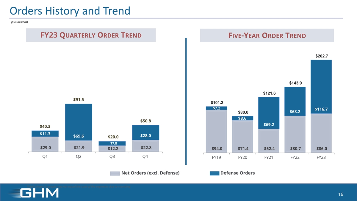 Orders History and Trend ($ in millions) FY23 QUARTERLY ORDER TREND FIVE-YEAR ORDER TREND $202.7 $143.9 $121.6 $91.5 $101.2 $7.2 $116.7 $63.2 $80.0 $8.6 $50.8 $69.2 $40.3 $11.3 $28.0 $69.6 $20.0 $7.8 $29.0 $21.9 $22.8 $12.2 $94.0 $71.4 $52.4 $80.7 $86.0 Q1 Q2 Q3 Q4 FY19 FY20 FY21 FY22 FY23 Net Orders (excl. Defense) Defense Orders Totals shown in graph may not equal the sum of the segments due to rounding 16