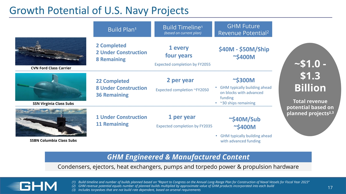 Growth Potential of U.S. Navy Projects GHM Future Build Timeline¹ Build Plan¹ 2 (based on current plan) Revenue Potential 2 Completed 1 every $40M - $50M/Ship 2 Under Construction four years ~$400M 8 Remaining Expected completion by FY2055 ~$1.0 - CVN Ford Class Carrier $1.3 2 per year ~$300M 22 Completed • GHM typically building ahead 8 Under Construction Expected completion ~FY2050 Billion on blocks with advanced 36 Remaining funding Total revenue • ~30 ships remaining SSN Virginia Class Subs potential based on ,3 planned projects² 1 Under Construction 1 per year ~$40M/Sub 11 Remaining Expected completion by FY2035 ~$400M • GHM typically building ahead SSBN Columbia Class Subs with advanced funding GHM Engineered & Manufactured Content Condensers, ejectors, heat exchangers, pumps and torpedo power & propulsion hardware (1) Build timeline and number of builds planned based on ”Report to Congress on the Annual Long-Range Plan for Construction of Naval Vessels for Fiscal Year 2023” (2) GHM revenue potential equals number of planned builds multiplied by approximate value of GHM products incorporated into each build 17 (3) Includes torpedoes that are not build rate dependent, based on arsenal requirements