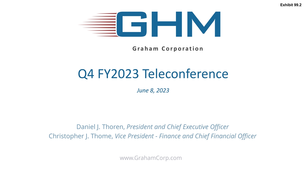 Exhibit 99.2 G r a h a m C o r p o r a t i o n Q4 FY2023 Teleconference June 8, 2023 Daniel J. Thoren, President and Chief Executive Officer Christopher J. Thome, Vice President - Finance and Chief Financial Officer www.GrahamCorp.com