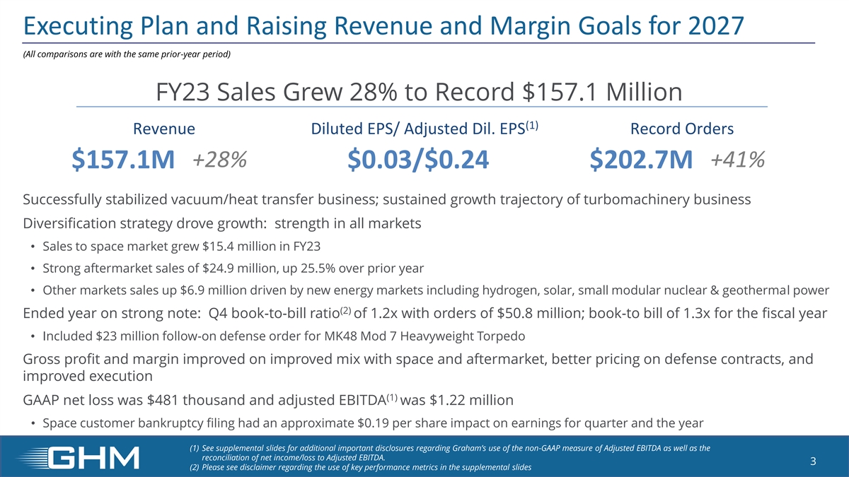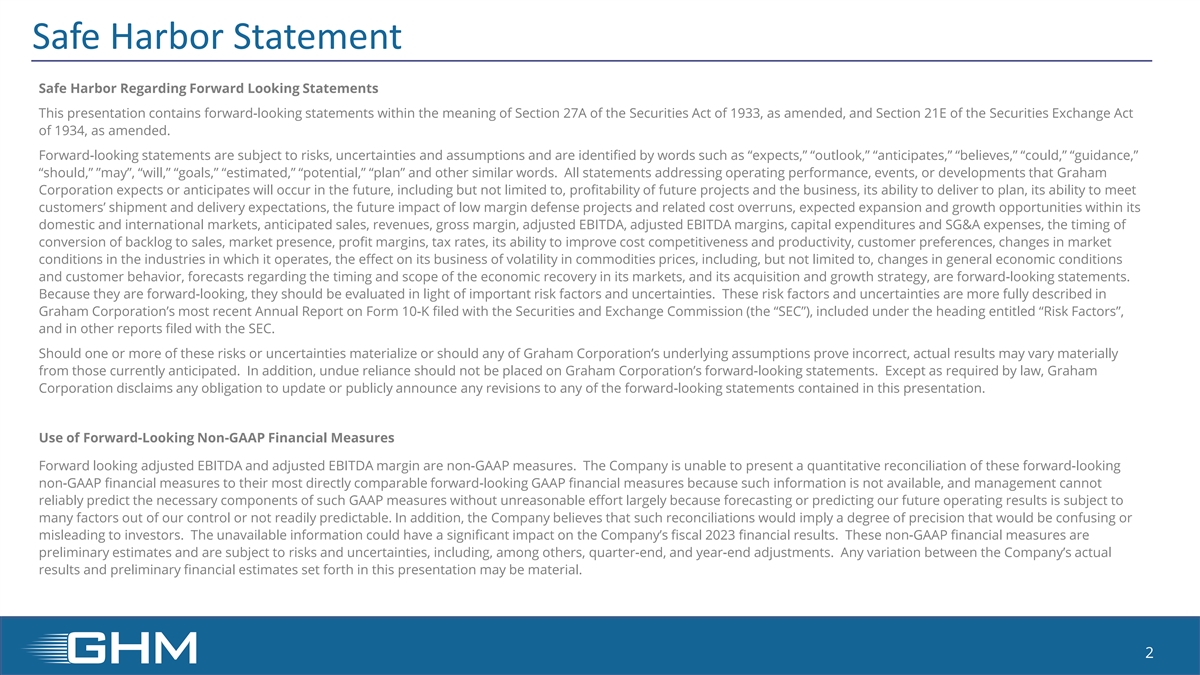 Safe Harbor Statement Safe Harbor Regarding Forward Looking Statements This presentation contains forward-looking statements within the meaning of Section 27A of the Securities Act of 1933, as amended, and Section 21E of the Securities Exchange Act of 1934, as amended. Forward-looking statements are subject to risks, uncertainties and assumptions and are identified by words such as “expects,” “outlook,” “anticipates,” “believes,” “could,” “guidance,” “should,” ”may”, “will,” “goals,” “estimated,” “potential,” “plan” and other similar words. All statements addressing operating performance, events, or developments that Graham Corporation expects or anticipates will occur in the future, including but not limited to, profitability of future projects and the business, its ability to deliver to plan, its ability to meet customers’ shipment and delivery expectations, the future impact of low margin defense projects and related cost overruns, expected expansion and growth opportunities within its domestic and international markets, anticipated sales, revenues, gross margin, adjusted EBITDA, adjusted EBITDA margins, capital expenditures and SG&A expenses, the timing of conversion of backlog to sales, market presence, profit margins, tax rates, its ability to improve cost competitiveness and productivity, customer preferences, changes in market conditions in the industries in which it operates, the effect on its business of volatility in commodities prices, including, but not limited to, changes in general economic conditions and customer behavior, forecasts regarding the timing and scope of the economic recovery in its markets, and its acquisition and growth strategy, are forward-looking statements. Because they are forward-looking, they should be evaluated in light of important risk factors and uncertainties. These risk factors and uncertainties are more fully described in Graham Corporation’s most recent Annual Report on Form 10-K filed with the Securities and Exchange Commission (the “SEC”), included under the heading entitled “Risk Factors”, and in other reports filed with the SEC. Should one or more of these risks or uncertainties materialize or should any of Graham Corporation’s underlying assumptions prove incorrect, actual results may vary materially from those currently anticipated. In addition, undue reliance should not be placed on Graham Corporation’s forward-looking statements. Except as required by law, Graham Corporation disclaims any obligation to update or publicly announce any revisions to any of the forward-looking statements contained in this presentation. Use of Forward-Looking Non-GAAP Financial Measures Forward looking adjusted EBITDA and adjusted EBITDA margin are non-GAAP measures. The Company is unable to present a quantitative reconciliation of these forward-looking non-GAAP financial measures to their most directly comparable forward-looking GAAP financial measures because such information is not available, and management cannot reliably predict the necessary components of such GAAP measures without unreasonable effort largely because forecasting or predicting our future operating results is subject to many factors out of our control or not readily predictable. In addition, the Company believes that such reconciliations would imply a degree of precision that would be confusing or misleading to investors. The unavailable information could have a significant impact on the Company’s fiscal 2023 financial results. These non-GAAP financial measures are preliminary estimates and are subject to risks and uncertainties, including, among others, quarter-end, and year-end adjustments. Any variation between the Company’s actual results and preliminary financial estimates set forth in this presentation may be material. 2