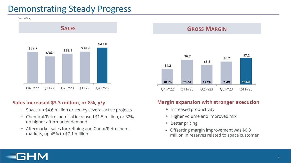 Executing Plan and Raising Revenue and Margin Goals for 2027 (All comparisons are with the same prior-year period) FY23 Sales Grew 28% to Record $157.1 Million (1) Revenue Diluted EPS/ Adjusted Dil. EPS Record Orders +28% +41% $157.1M $0.03/$0.24 $202.7M Successfully stabilized vacuum/heat transfer business; sustained growth trajectory of turbomachinery business Diversification strategy drove growth: strength in all markets • Sales to space market grew $15.4 million in FY23 • Strong aftermarket sales of $24.9 million, up 25.5% over prior year • Other markets sales up $6.9 million driven by new energy markets including hydrogen, solar, small modular nuclear & geothermal power (2) Ended year on strong note: Q4 book-to-bill ratio of 1.2x with orders of $50.8 million; book-to bill of 1.3x for the fiscal year • Included $23 million follow-on defense order for MK48 Mod 7 Heavyweight Torpedo Gross profit and margin improved on improved mix with space and aftermarket, better pricing on defense contracts, and improved execution (1) GAAP net loss was $481 thousand and adjusted EBITDA was $1.22 million • Space customer bankruptcy filing had an approximate $0.19 per share impact on earnings for quarter and the year (1) See supplemental slides for additional important disclosures regarding Graham’s use of the non-GAAP measure of Adjusted EBITDA as well as the reconciliation of net income/loss to Adjusted EBITDA. 3 (2) Please see disclaimer regarding the use of key performance metrics in the supplemental slides