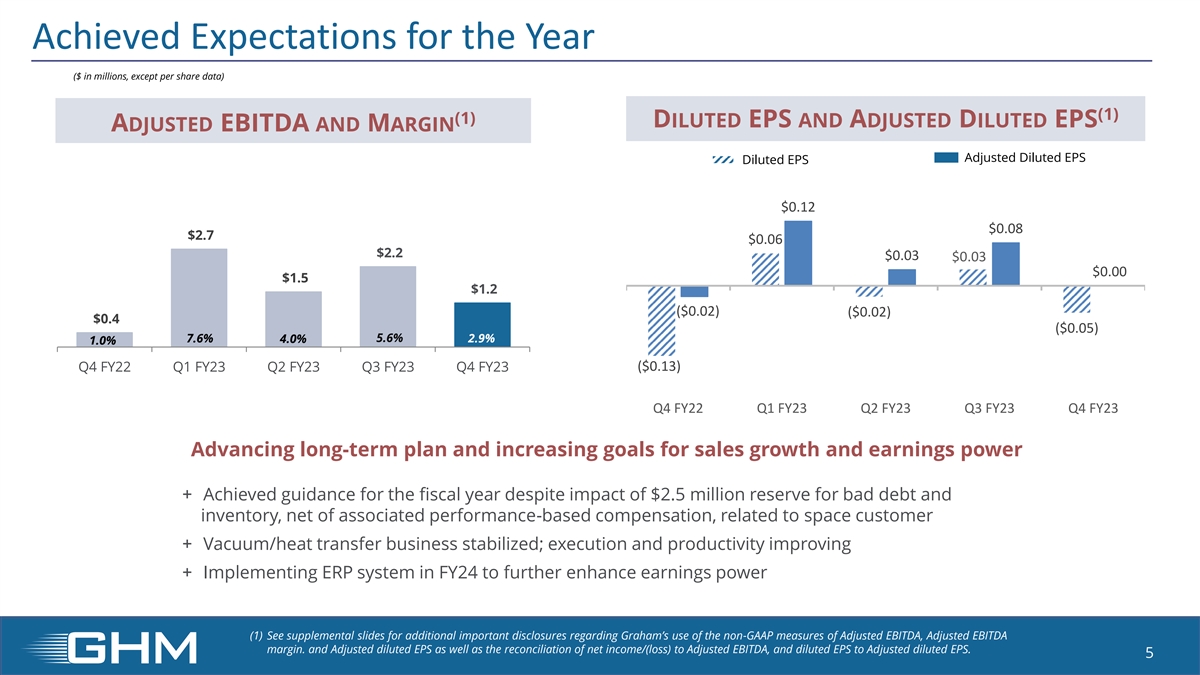 Demonstrating Steady Progress ($ in millions) SALES GROSS MARGIN $43.0 $39.7 $39.9 $38.1 $36.1 $7.2 $6.7 $6.2 $5.3 $4.2 10.6% 18.7% 16.6% 13.8% 15.6% Q4 FY22 Q1 FY23 Q2 FY23 Q3 FY23 Q4 FY23 Q4 FY22 Q1 FY23 Q2 FY23 Q3 FY23 Q4 FY23 Margin expansion with stronger execution Sales increased $3.3 million, or 8%, y/y + Increased productivity + Space up $4.6 million driven by several active projects + Higher volume and improved mix + Chemical/Petrochemical increased $1.5 million, or 32% on higher aftermarket demand + Better pricing + Aftermarket sales for refining and Chem/Petrochem - Offsetting margin improvement was $0.8 markets, up 45% to $7.1 million million in reserves related to space customer 4