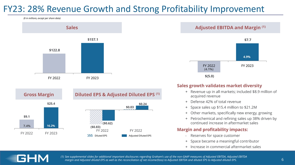 Achieved Expectations for the Year ($ in millions, except per share data) (1) (1) DILUTED EPS AND ADJUSTED DILUTED EPS ADJUSTED EBITDA AND MARGIN Adjusted Diluted EPS Diluted EPS $0.12 $0.08 $2.7 $0.06 $2.2 $0.03 $0.03 $0.00 $1.5 $1.2 6.7% ($0.02) ($0.02) $0.4 ($0.05) 7.6% 5.6% 2.9% 4.0% 1.0% Q4 FY22 Q1 FY23 Q2 FY23 Q3 FY23 Q4 FY23 ($0.13) Q4 FY22 Q1 FY23 Q2 FY23 Q3 FY23 Q4 FY23 Advancing long-term plan and increasing goals for sales growth and earnings power + Achieved guidance for the fiscal year despite impact of $2.5 million reserve for bad debt and 15.6% inventory, net of associated performance-based compensation, related to space customer + Vacuum/heat transfer business stabilized; execution and productivity improving + Implementing ERP system in FY24 to further enhance earnings power (1) See supplemental slides for additional important disclosures regarding Graham’s use of the non-GAAP measures of Adjusted EBITDA, Adjusted EBITDA margin. and Adjusted diluted EPS as well as the reconciliation of net income/(loss) to Adjusted EBITDA, and diluted EPS to Adjusted diluted EPS. 5