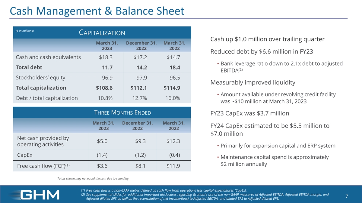 FY23: 28% Revenue Growth and Strong Profitability Improvement ($ in millions, except per share data) (1) Sales Adjusted EBITDA and Margin $157.1 $7.7 $122.8 4.9% FY 2022 FY 2023 (4.1%) $(5.0) FY 2022 FY 2023 Sales growth validates market diversity + Revenue up in all markets; included $8.9 million of (1) Gross Margin Diluted EPS & Adjusted Diluted EPS acquired revenue + Defense 42% of total revenue $25.4 $0.24 $0.03 + Space sales up $15.4 million to $21.2M + Other markets, specifically new energy, growing $9.1 + Petrochemical and refining sales up 38% driven by ($0.62) continued increase in aftermarket sales 16.2% 7.4% ($0.83) Margin and profitability impacts: FY 2022 FY 2022 FY 2022 FY 2023 Diluted EPS Adjusted Diluted EPS - Reserves for space customer + Space became a meaningful contributor + Increase in commercial aftermarket sales (1) See supplemental slides for additional important disclosures regarding Graham’s use of the non-GAAP measures of Adjusted EBITDA, Adjusted EBITDA margin and Adjusted diluted EPS as well as the reconciliation of net income/(loss) to Adjusted EBITDA and diluted EPS to Adjusted diluted EPS. 6
