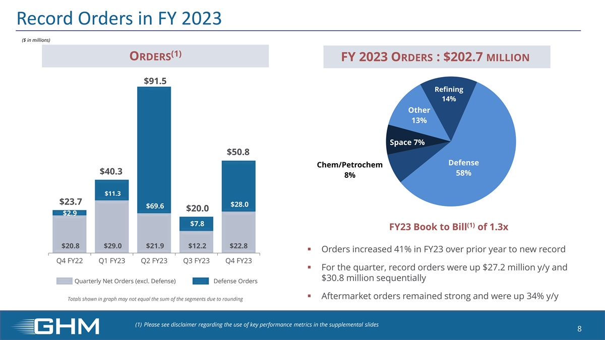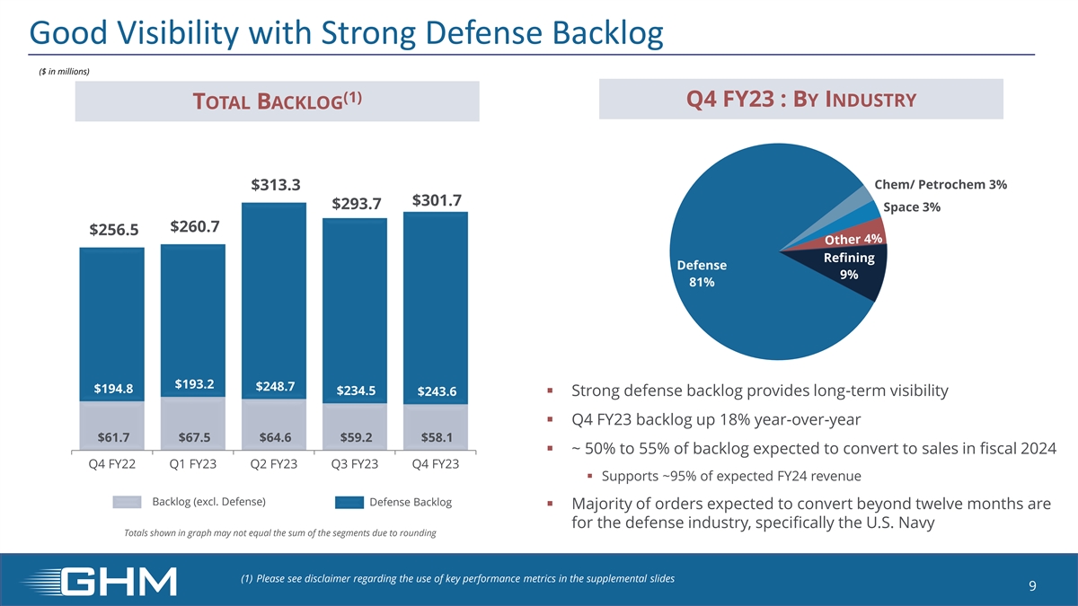 Record Orders in FY 2023 ($ in millions) (1) ORDERS FY 2023 ORDERS : $202.7 MILLION $91.5 Refining 14% Other 13% Space 7% $50.8 Defense Chem/Petrochem $40.3 58% 8% $11.3 $23.7 $28.0 $69.6 $20.0 $2.9 $7.8 (1) FY23 Book to Bill of 1.3x $20.8 $29.0 $21.9 $12.2 $22.8 ▪ Orders increased 41% in FY23 over prior year to new record Q4 FY22 Q1 FY23 Q2 FY23 Q3 FY23 Q4 FY23 ▪ For the quarter, record orders were up $27.2 million y/y and $30.8 million sequentially Quarterly Net Orders (excl. Defense) Defense Orders ▪ Aftermarket orders remained strong and were up 34% y/y Totals shown in graph may not equal the sum of the segments due to rounding (1) Please see disclaimer regarding the use of key performance metrics in the supplemental slides 8
